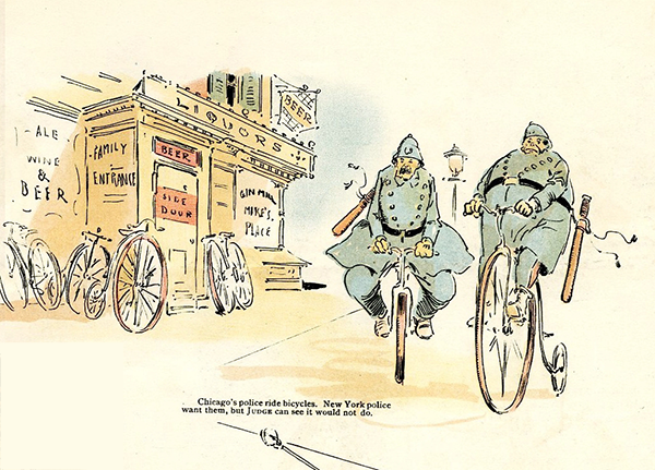 As with any new trend, this two-wheeled contraption faced its share of critics. An 1893 edition of Judge Magazine spoofed the craze, creating cartoon vignettes of all the silly developments that could come from it. One such scene (see left) pictures two portly policemen trying to balance on the spindly wheels of turn-of-the-century bicycles, with a caption that reads, “it would not do.”